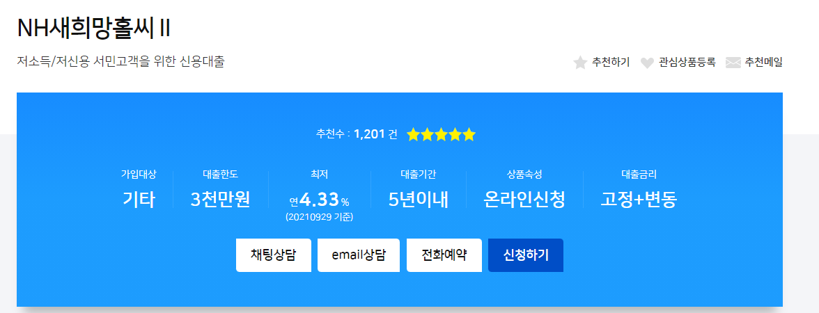안녕하세요 오늘은 NH농협 저소득자 대출 조건 한도 알아볼게요 저소득/저신용 고객들을 위한 상품인 새희망홀씨 상품에 대해 소개하는 시간 가져볼게요 새희망홀씨 상품은 서민들을 대상으로 최대 3000만원의 대출 한도와 넉넉한 상환 기간을 바탕으로 하여 대출 해주는 상품이라고 할 수 있어요